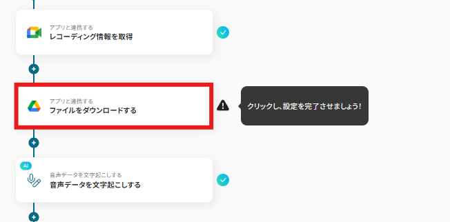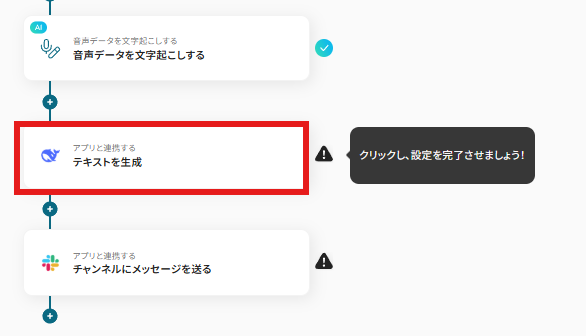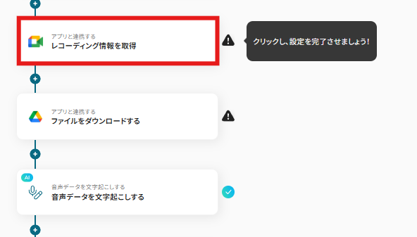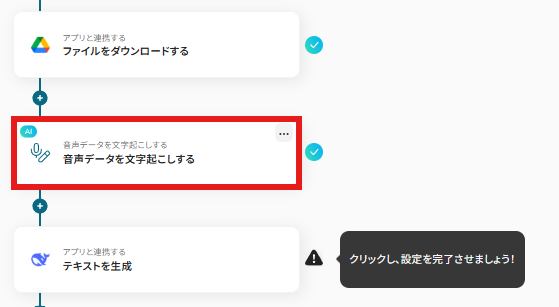 AIを使用し音声データを文字起こしするための設定がテンプレートで既に設定されていますが、確認していきましょう。