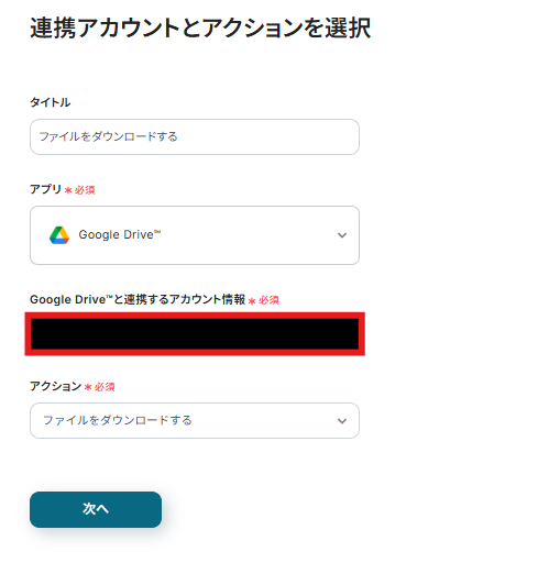 連携アカウントとアクションを選択する画面が表示されるので、今回連携するGoogle Driveのアカウントを確認し「次へ」をクリックします。