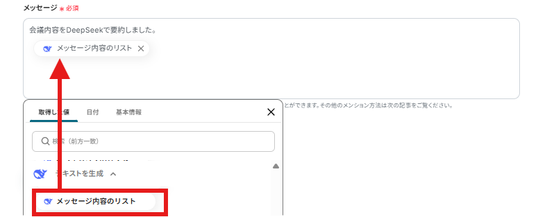 Slackで受け取るメッセージには、DeepSeekで要約したことと、その内容を反映したテキストを入力します。