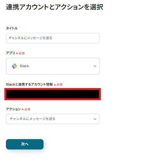 連携アカウントとアクションを選択する画面が表示されるので、今回連携するSlackのアカウントを確認し「次へ」をクリックします。