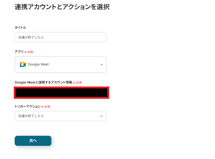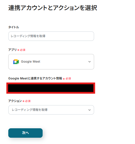 連携アカウントとアクションを選択する画面が表示されるので、今回連携するGoogle Meetのアカウントを確認し「次へ」をクリックします。