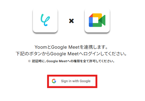 YoomとGoogle Meetの連携画面が表示されるので、赤枠の「Sign in with Google」をクリックします。