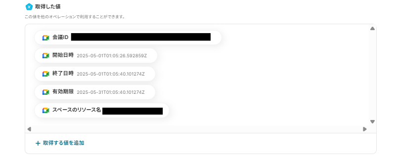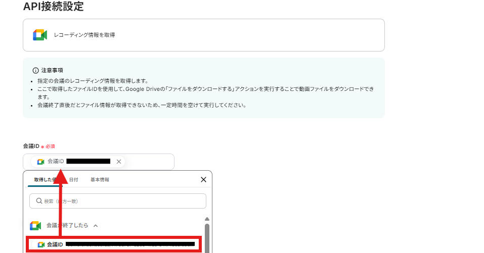 API接続設定では、以下のように会議IDの箇所に取得した値から「会議ID」を入力します。