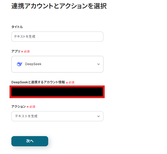 連携アカウントとアクションを選択する画面が表示されるので、今回連携するDeepSeekのアカウントを確認し「次へ」をクリックします。