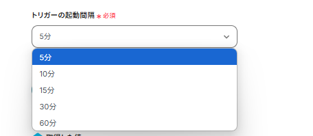 次に、アプリトリガー起動間隔の設定です。トリガーの起動間隔は5分・10分・15分・30分・60分から選択できます。