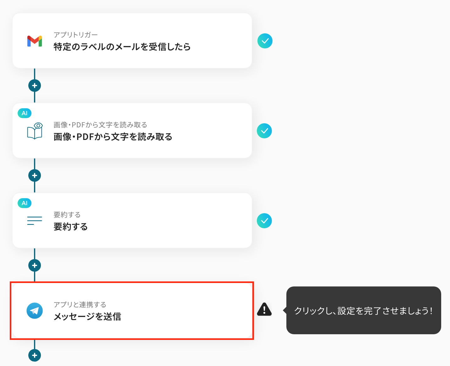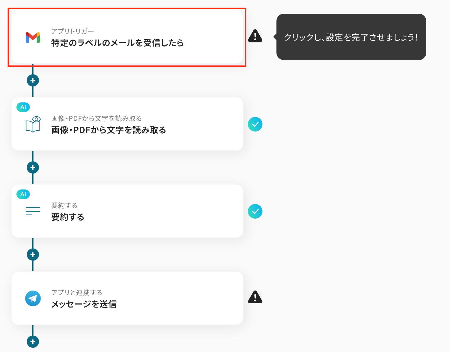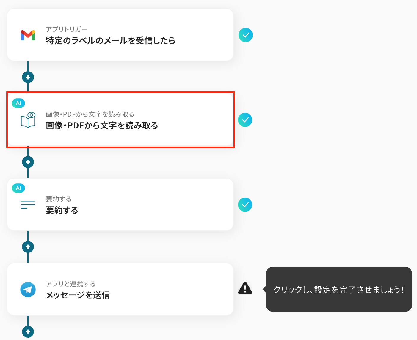 - Gmailのトリガー設定とOCR処理、AIによる要約、Telegramへの通知アクションを設定