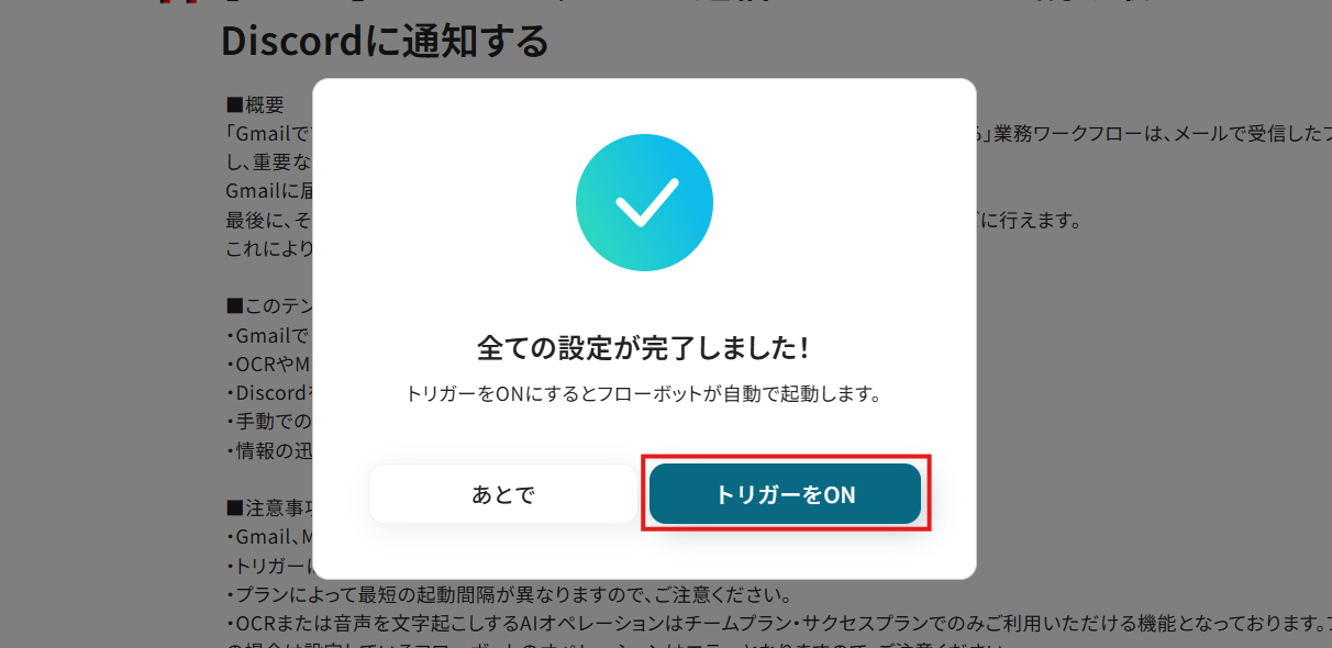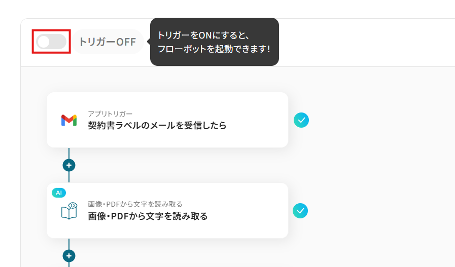 あとで稼働させる場合は、フロー画面のトリガースイッチをクリックすることで、トリガーをONにできます。