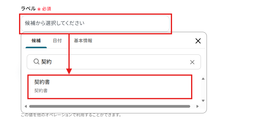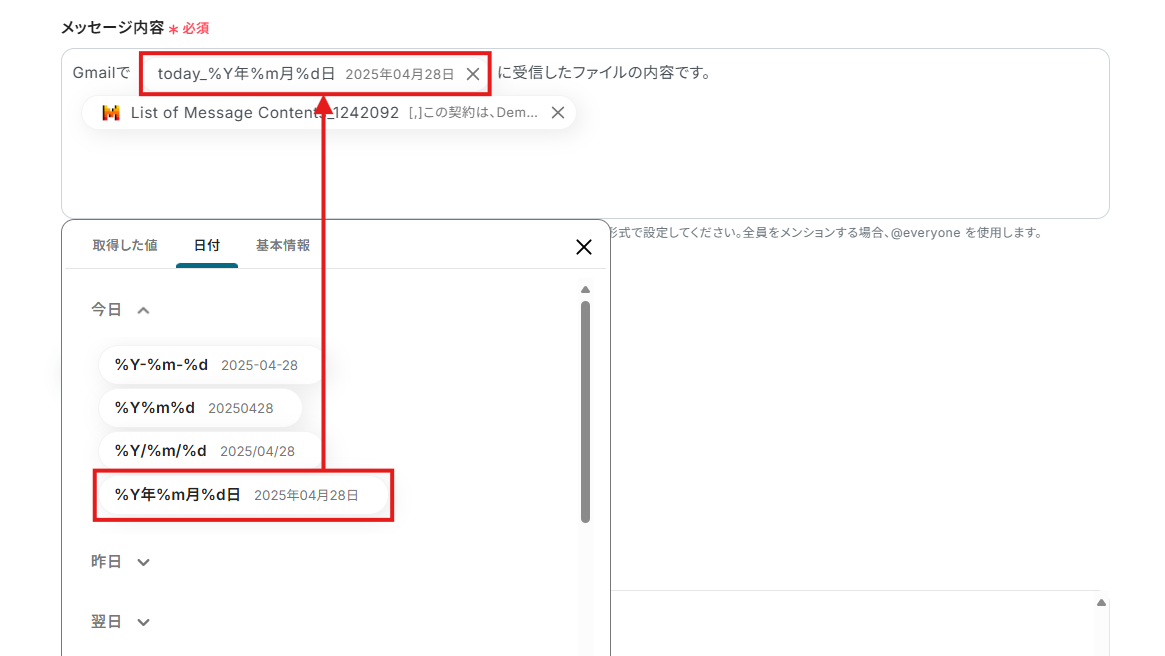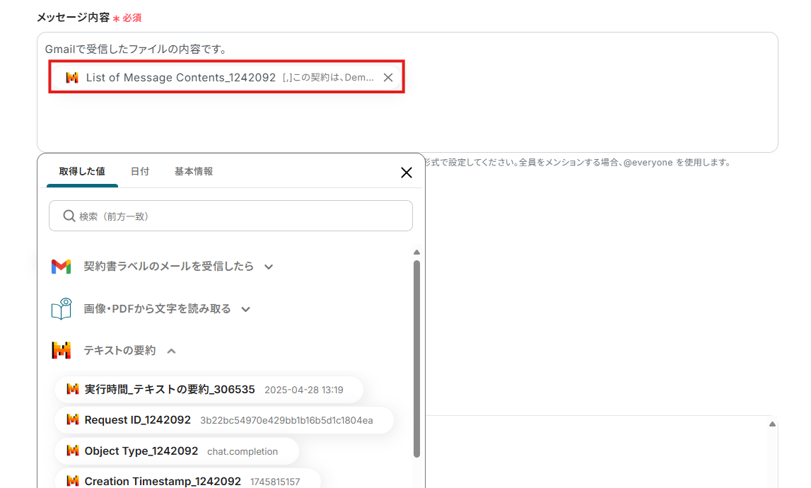 入力欄クリック時に表示される「取得した値」タブから、各アクションで取得した値が選択可能です。