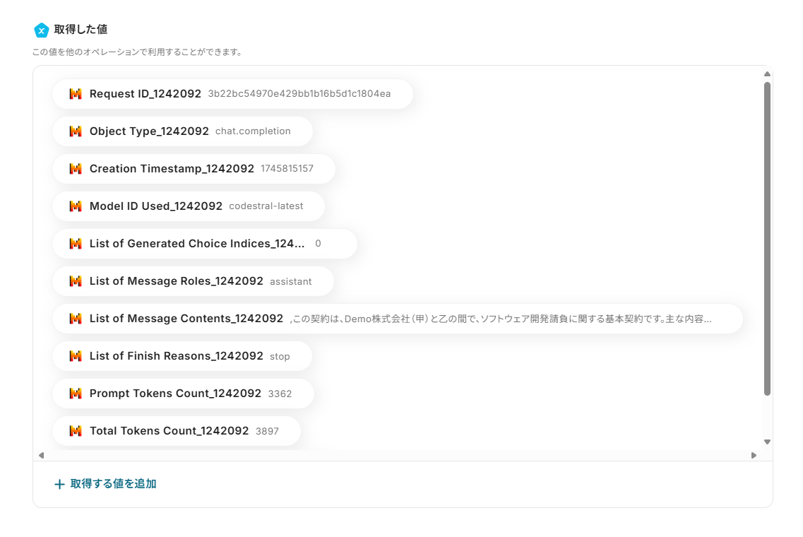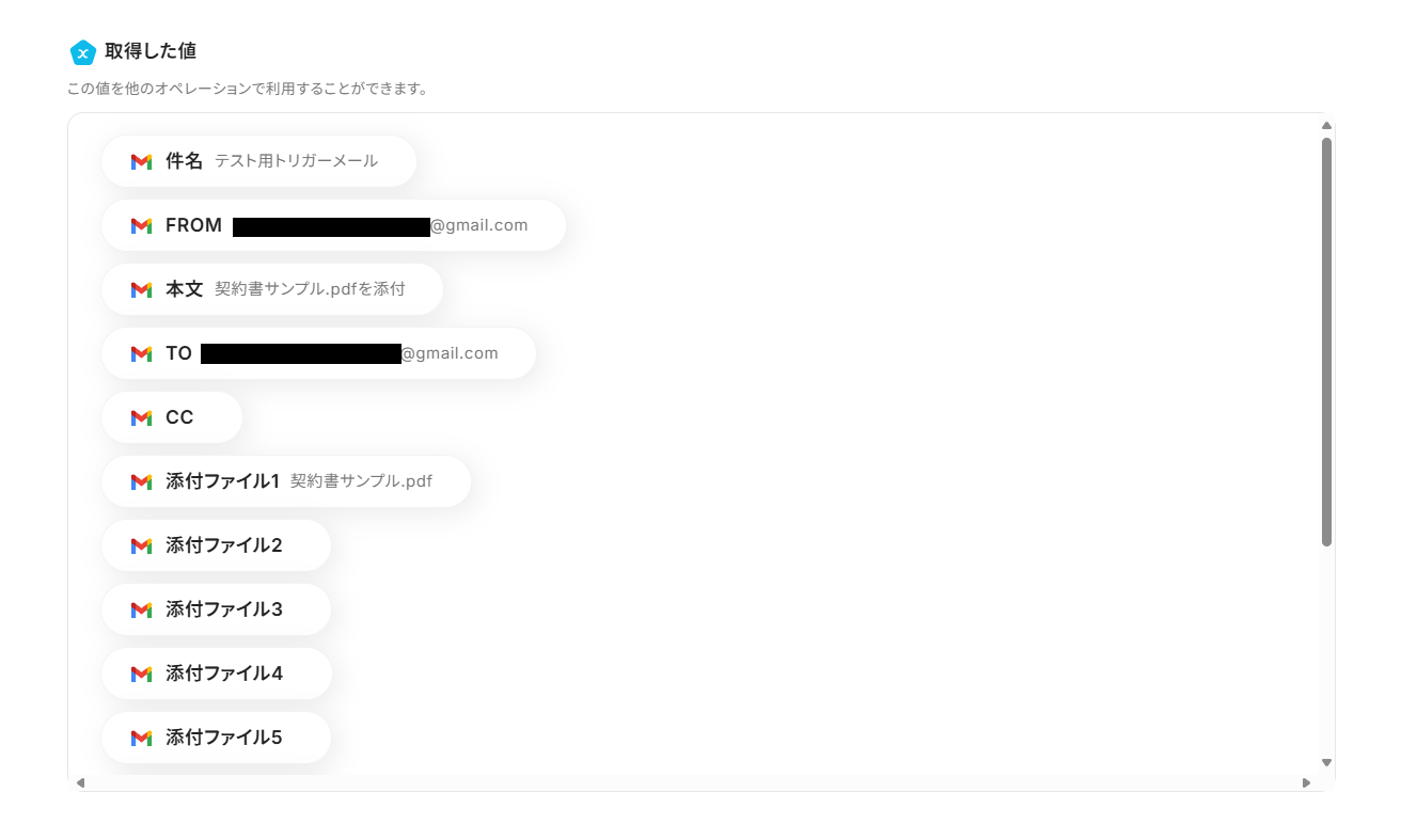- テストに成功すると、「抽出したい項目」に設定した項目の値がファイルから抽出され、「取得した値」に追加されます。
