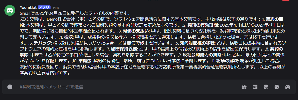 指定したラベルのメールを送信し、メールに添付したファイルの要約がDiscordに通知されていれば成功です。