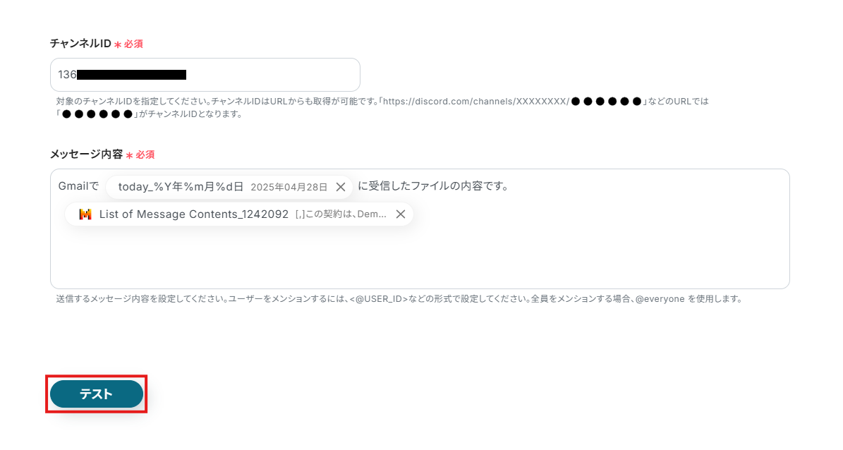 - 「チャンネルID」に、メッセージを送信するチャンネルのIDを設定。