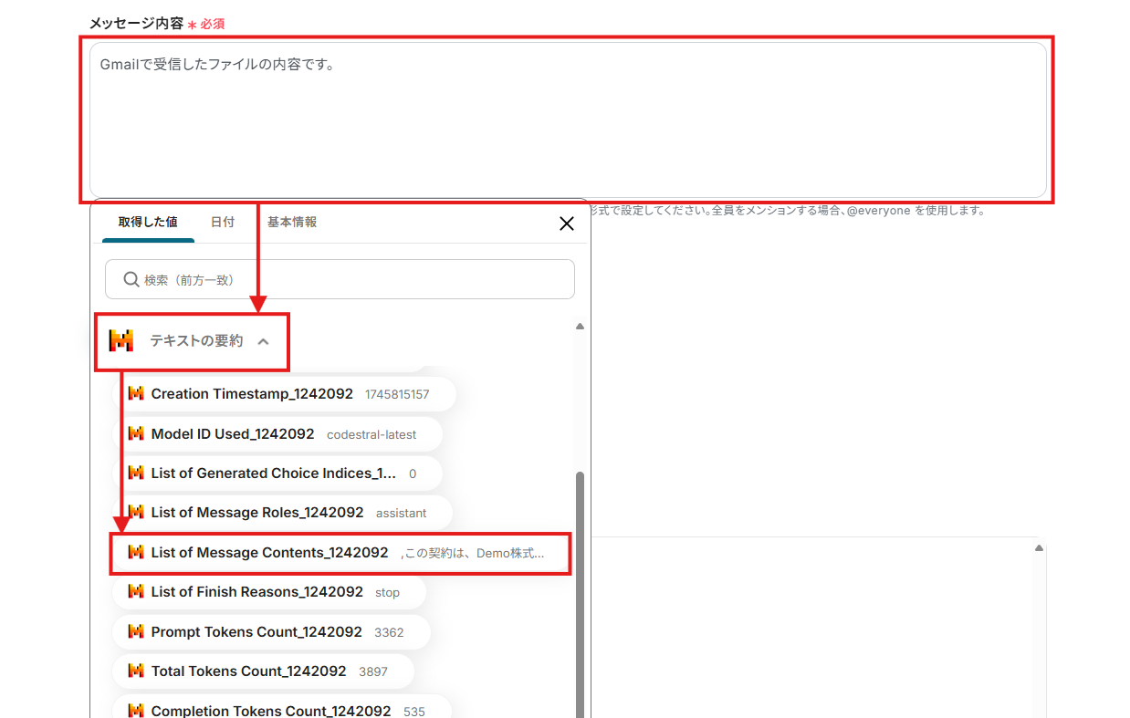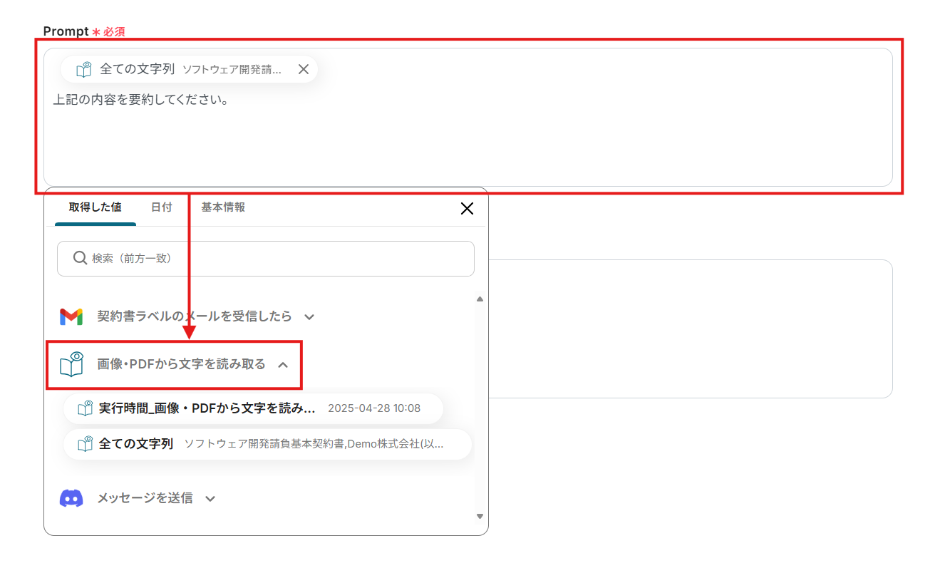 入力欄をクリックし、「取得した値」のOCRアクションのメニューから、要約したい項目を選択してください。