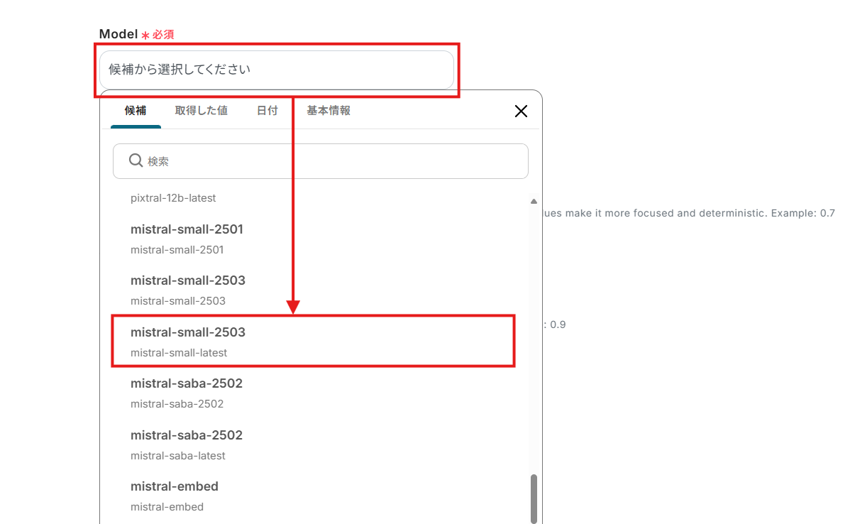 - 「Model」の入力欄をクリックし、表示される候補からテキスト生成に用いるモデルを選択。
