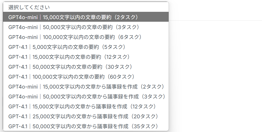 文字数に合わせて選択してください。 ()内のタスクを消費するのでご注意ください。「タスク実行数」のカウント方法について