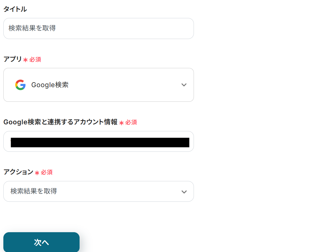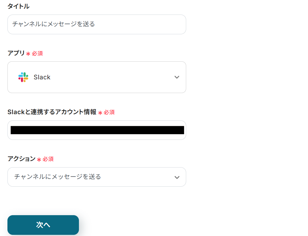 タイトルと連携するアカウント情報を任意で設定し、アクションはテンプレート通りのまま「次へ」をクリックして進んでください。