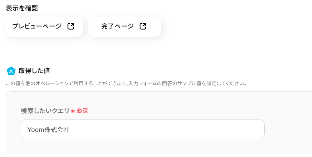 続いて、フォーム内容を使って検索する設定を行うため、「検索結果を取得 」をクリックします。