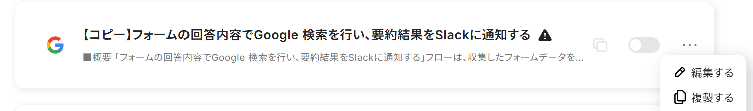 以下の画像が表示されたら、トリガーをONにしてください。 これですべての設定が完了したので、フォームの回答内容でGoogle 検索を行い、要約結果がSlackに通知されるかを確認してみましょう。