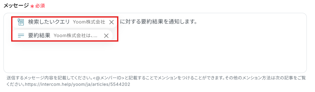 メッセージ :設定されていますが、変更することも可能です。 ※アウトプットから選択した項目は赤枠のように表示されます。 値を引用している印なので、これによってトリガーで取得した値をそのまま利用できます。 トリガーから取得した項目は、必ずアウトプットから選択してください。