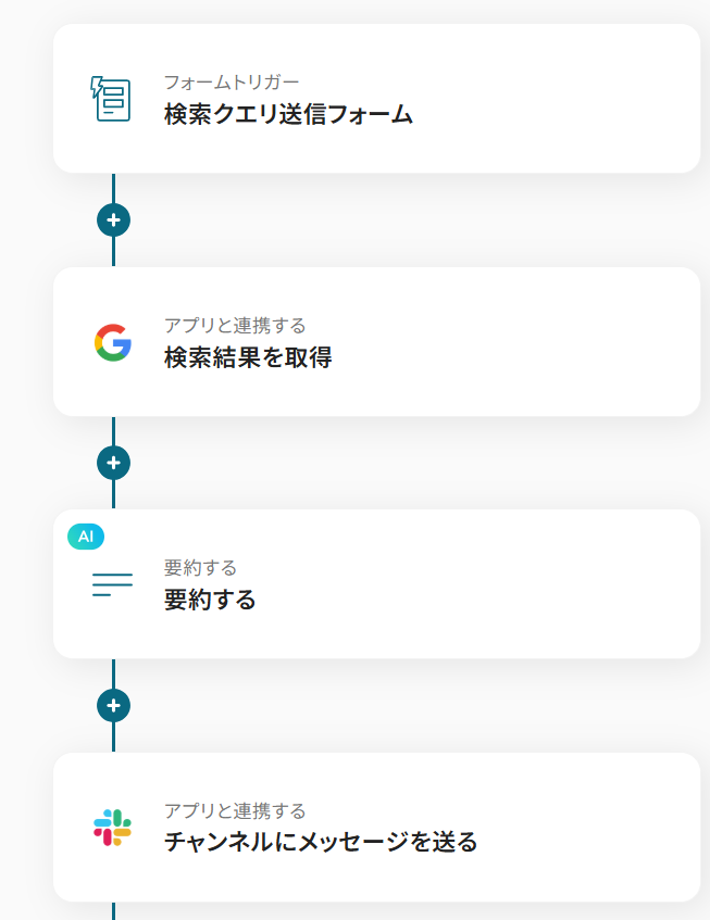 フォームに入力されたキーワードでGoogle 検索を行い、AIが生成した要約結果をSlackやMicrosoft Teamsなどのチャットツールに自動で通知します。