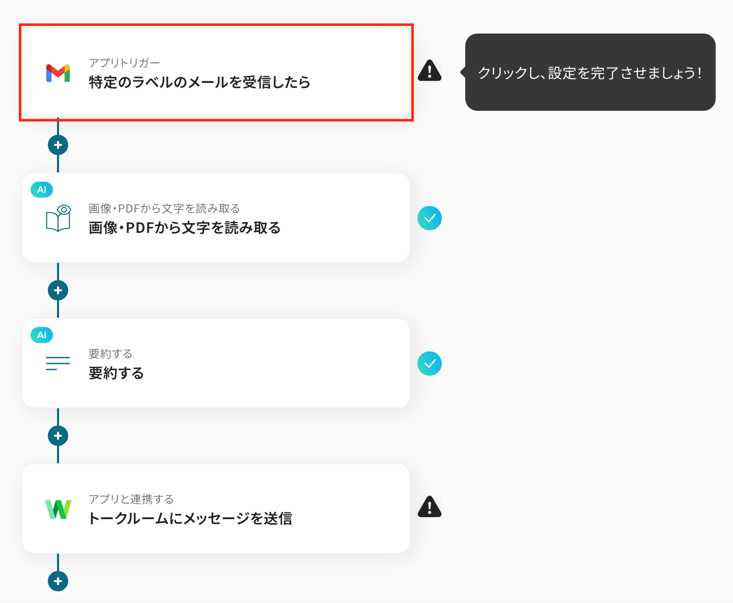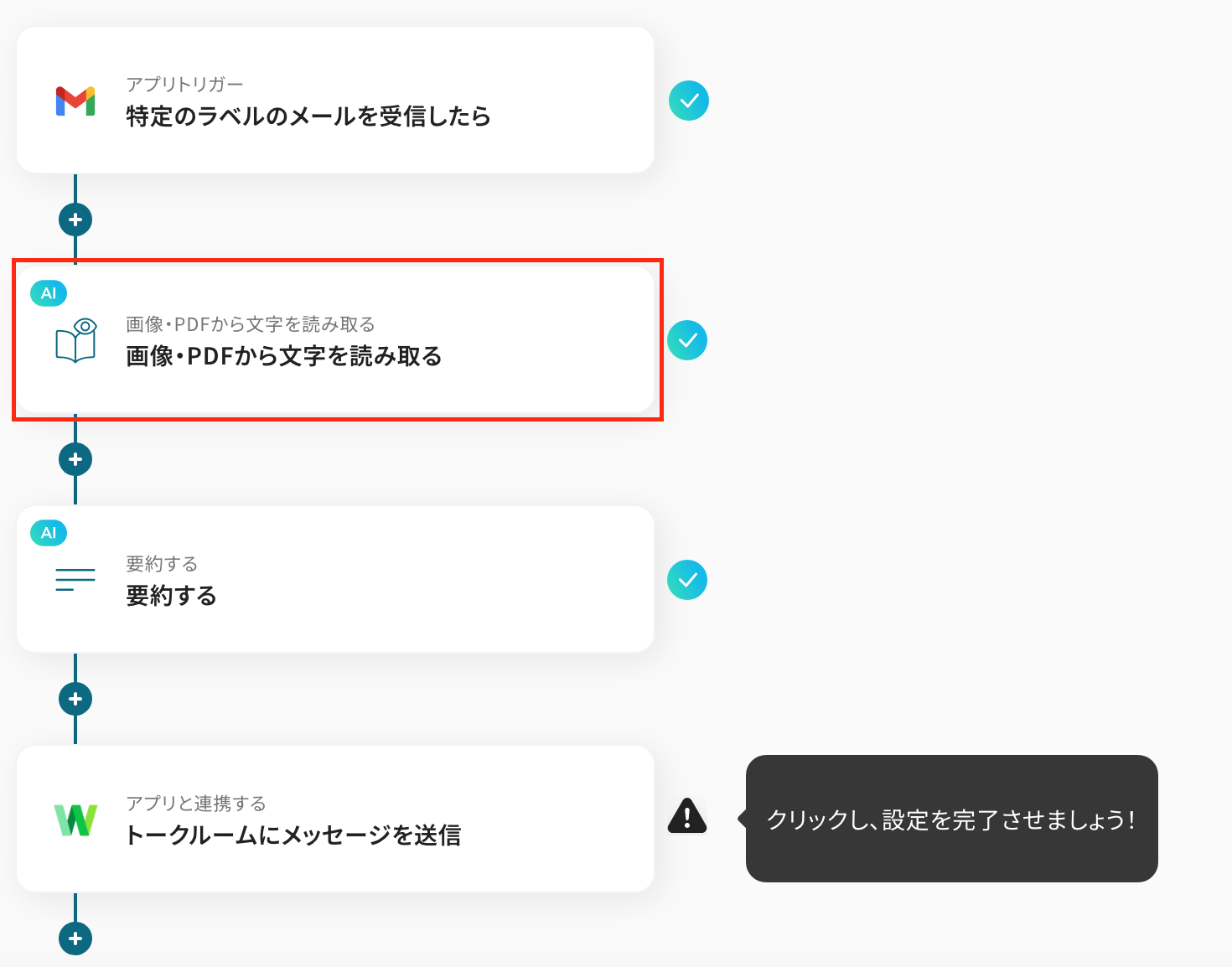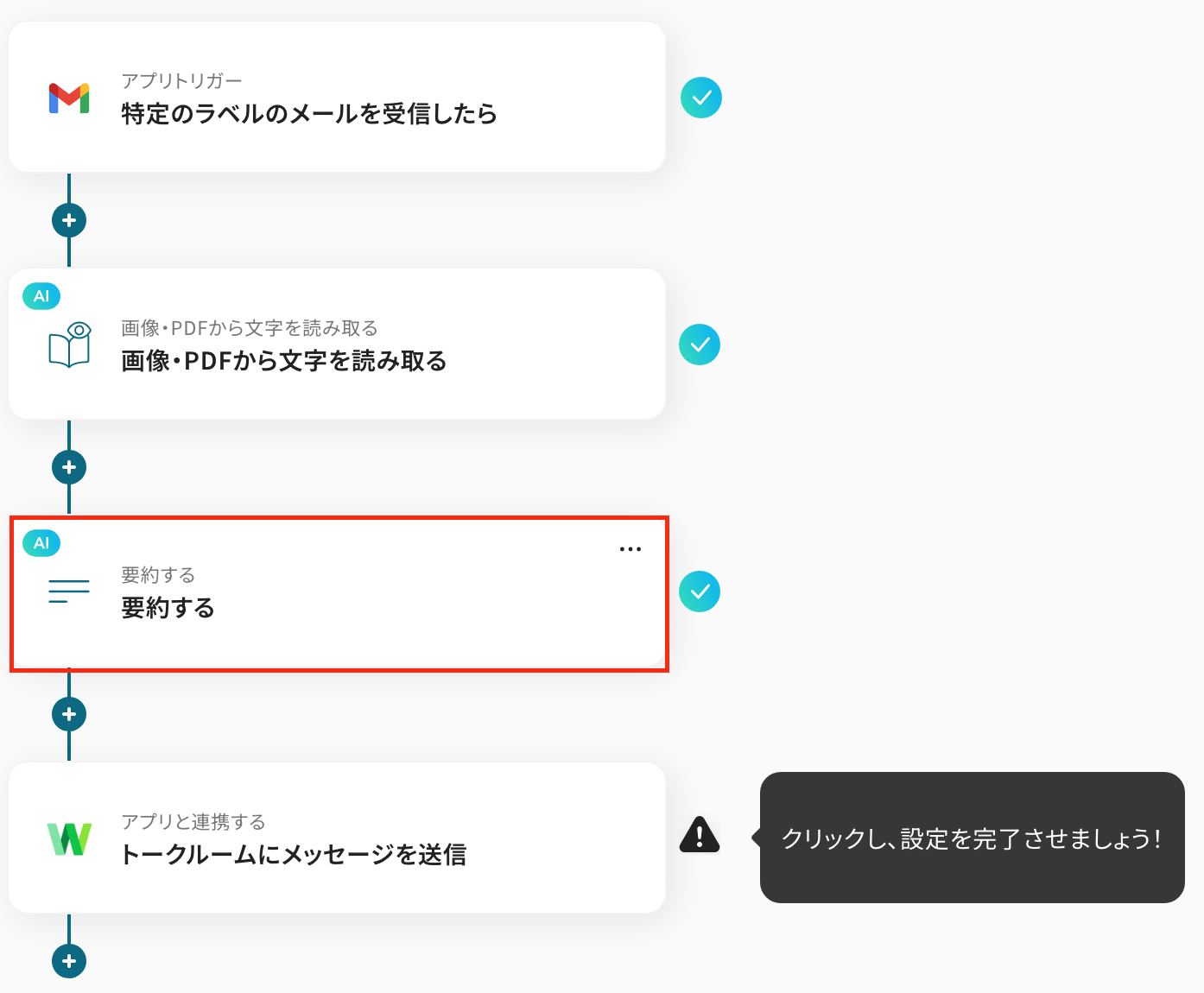 - Gmailのトリガー設定とOCR処理、AIによる要約、LINE WORKSへの通知アクションを設定