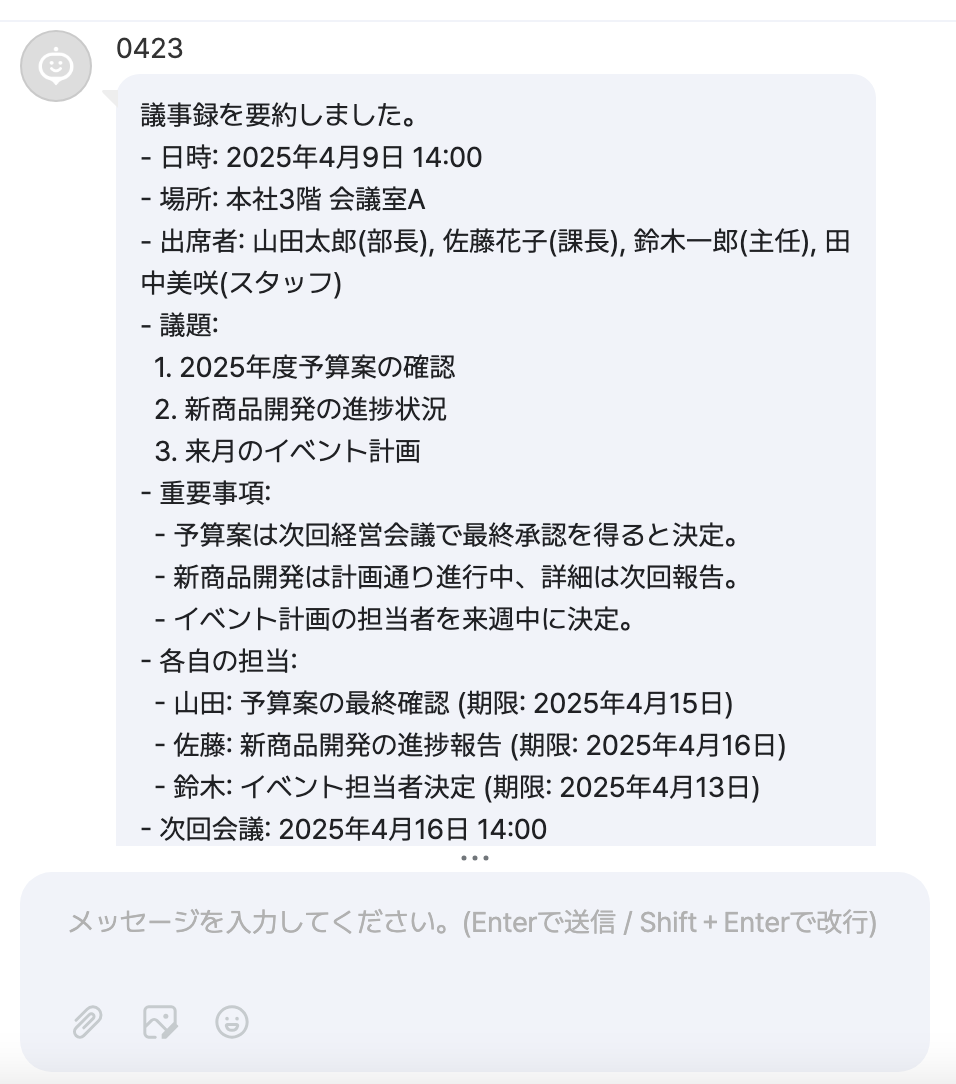 文章の要約機能を活用して会議録の要点を抽出し、LINE WORKSに自動で通知することで、手作業による確認や共有の手間を省くことができます。これにより、会議の振り返りや情報連携がスムーズに行えるようになります。