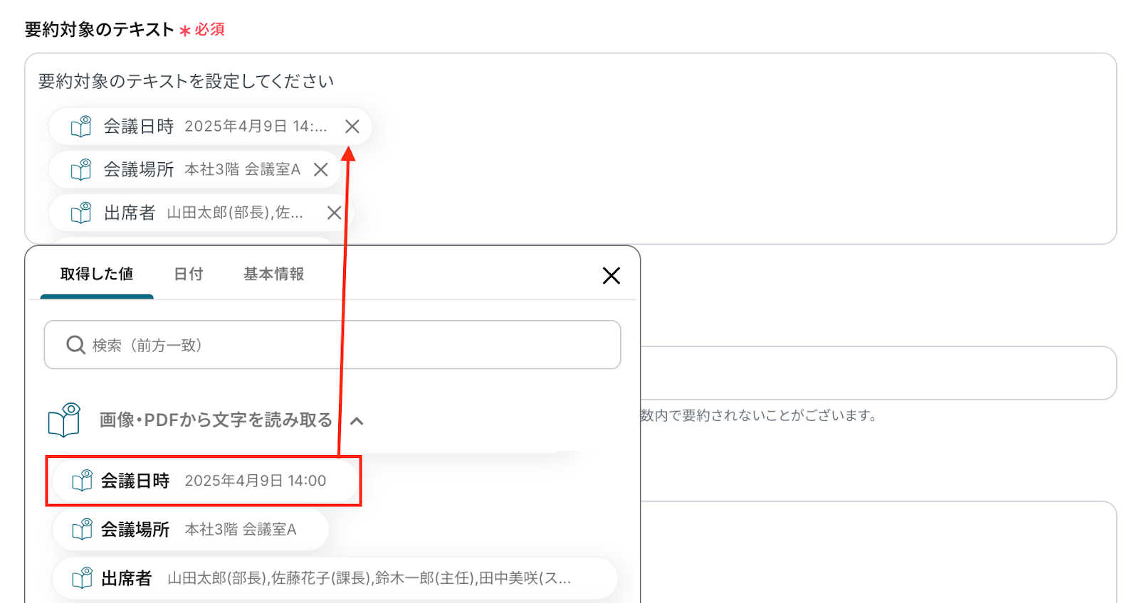 要約対象のテキストはすでに設定されていますが、「取得した値」から選択することもできます。
