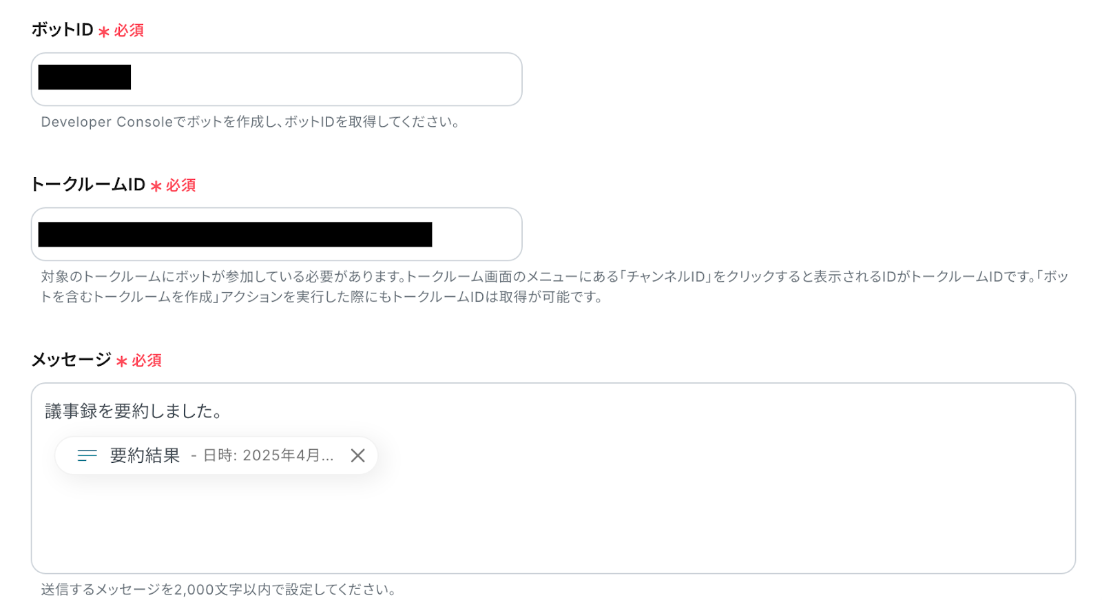 トークルームID:トークルーム画面のメニューにある「チャンネルID」をクリックすると表示されるID。※対象のトークルームにボットが参加している必要があります。