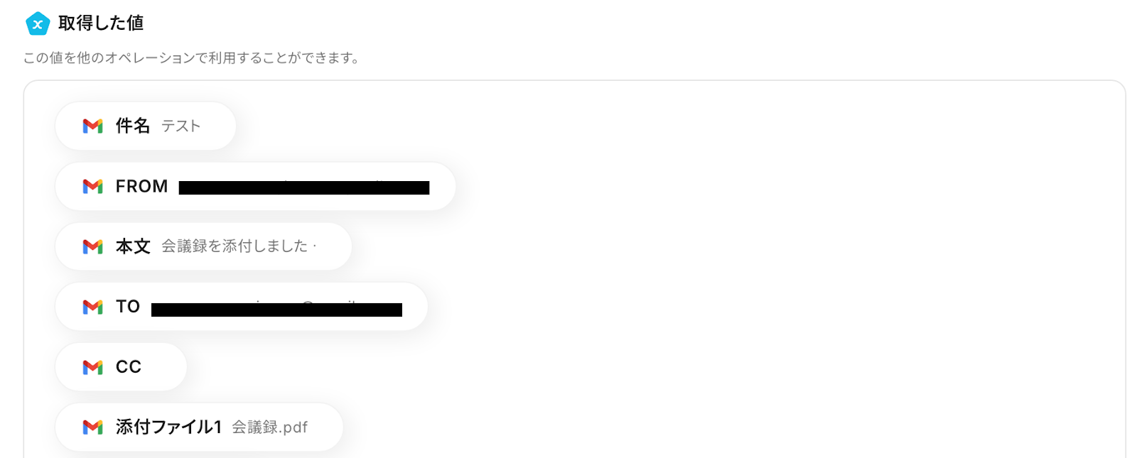 メッセージ:今回は以下のように設定しました。入力欄をクリックして表示される「取得した値」から選択ができます。