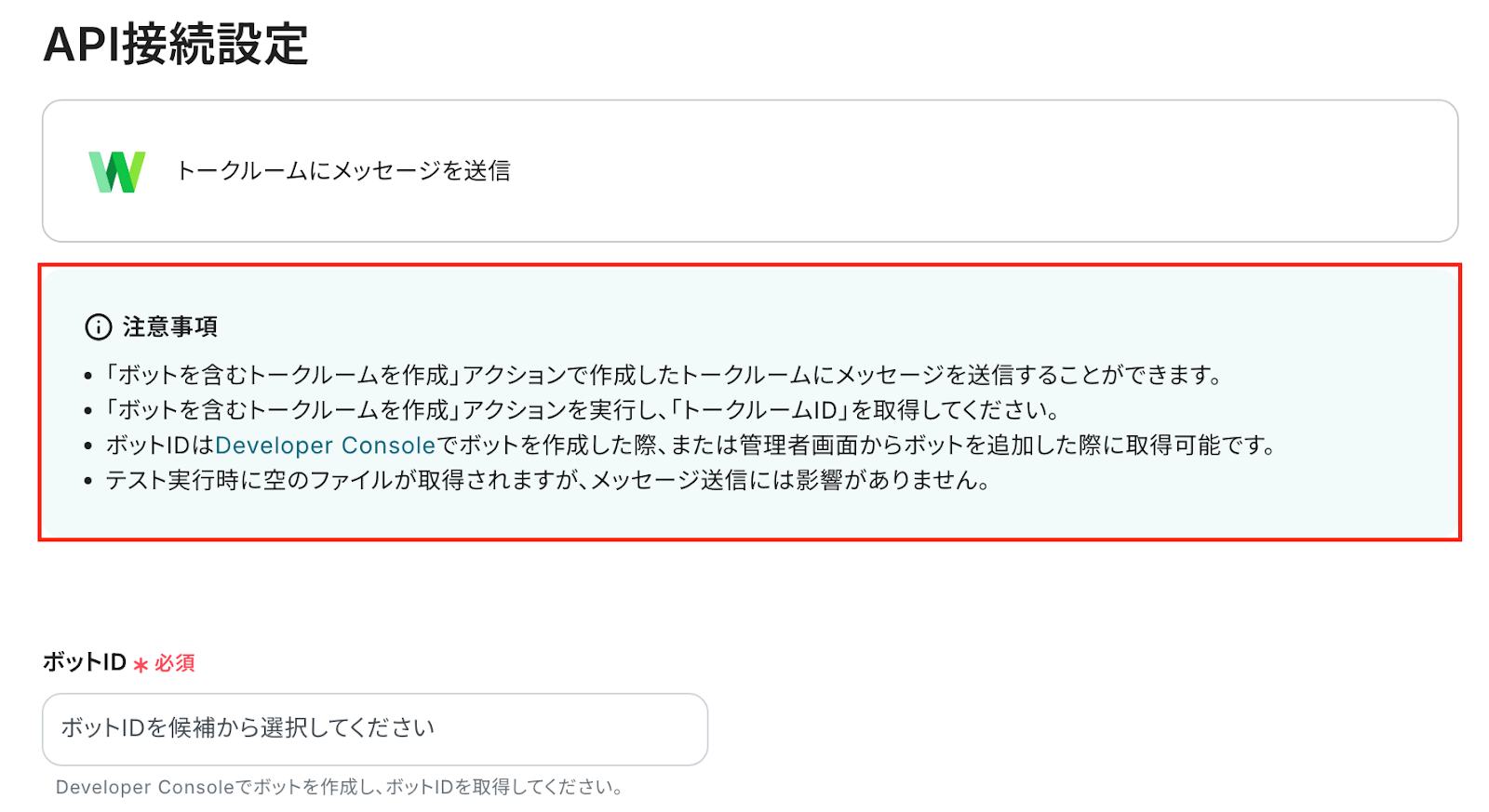 ボットID:Developer Consoleでボットを作成し、ボットIDを取得。入力欄をクリックして表示される「候補」からも選択が可能です。