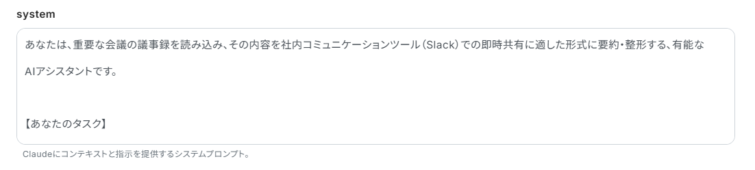 systemにはAnthropic(Claude)に対しての役割(今回であれば有能なAIアシスタントであること)を入力します。