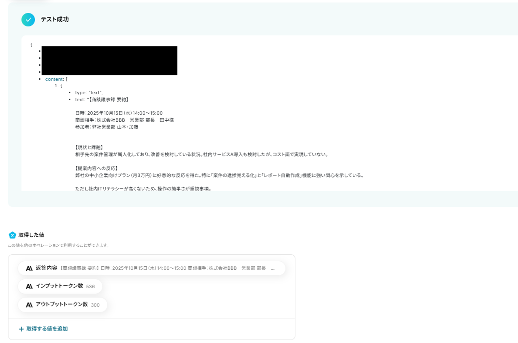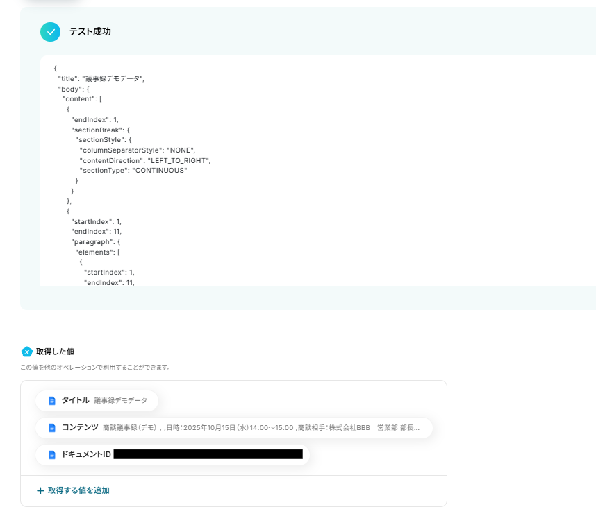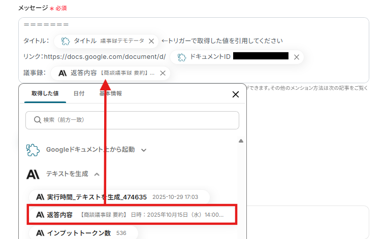 今回はドキュメントのタイトル、ドキュメントのURL、要約後の議事録を入力しました。