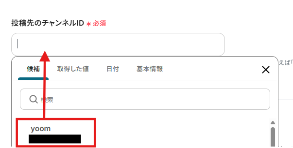 投稿先のチャンネルIDは以下のように表示される候補から選択しましょう。
