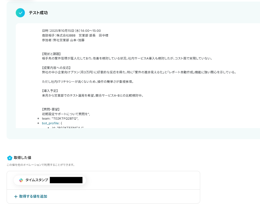 テスト成功後、以下の画面のように取得した値にメッセージの内容が表示されます。