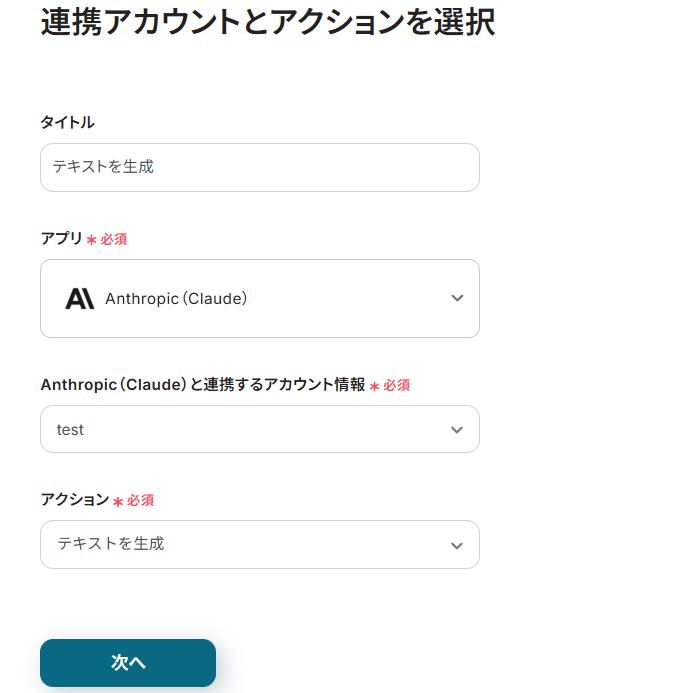 連携アカウントとアクションを選択する画面が表示されるので、今回連携するAnthropic(Claude)のアカウントを確認し「次へ」をクリックします。