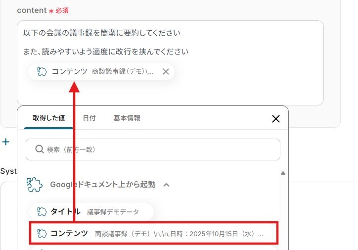 contentsには以下のように要約の指示と、拡張機能から取得した値を用い、ドキュメントの内容(コンテンツ)を入力しましょう。
