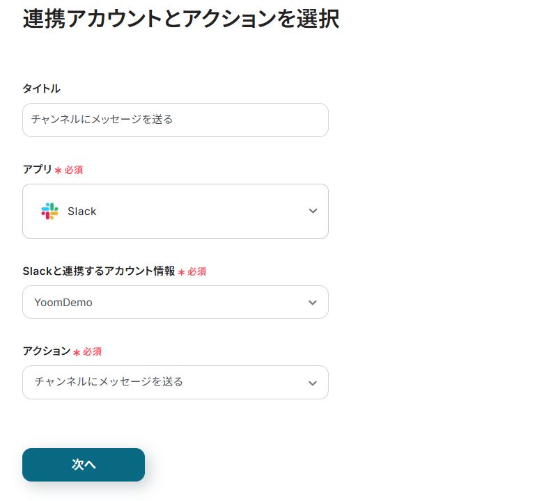 連携アカウントとアクションを選択する画面が表示されるので、今回連携するSlackのアカウントを確認し「次へ」をクリックします。