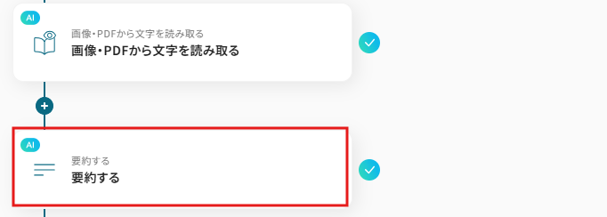 まず、OCR(光学的文字認識)技術を使って、ツールに保存、送信されたPDFファイルからテキスト情報を抽出し、次に生成AIがそのテキスト内容を分かりやすく要約します。連携次第では要約結果をメールツールやチャットツール、データベースツールなど、普段業務で使っているツールに自動で送信・格納可能です!