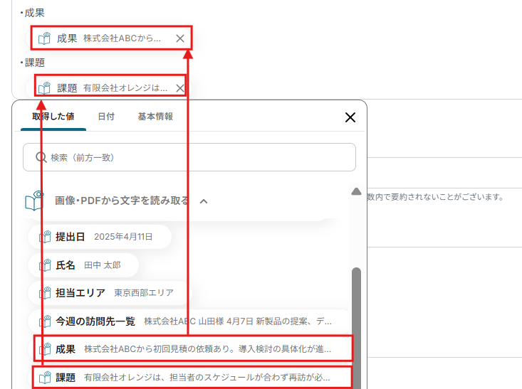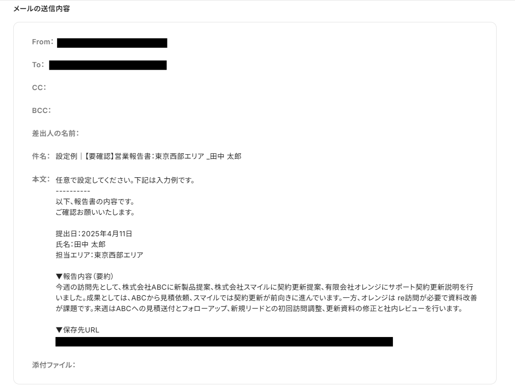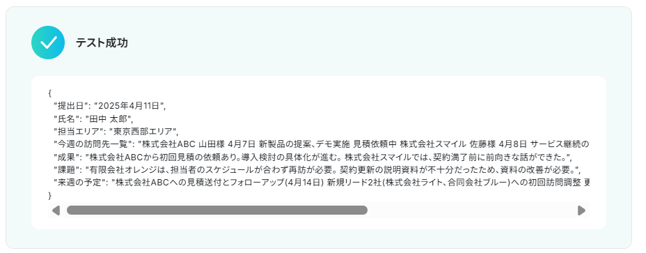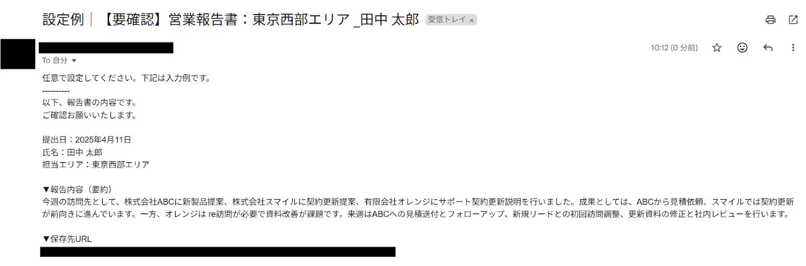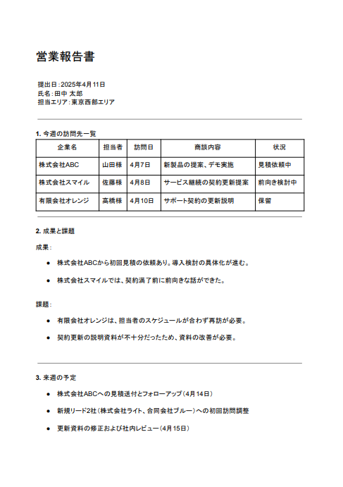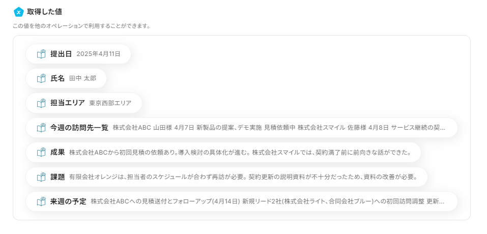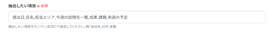 今回は営業報告書の以下項目を抽出する想定です。 自身の業務に合わせて設定してくださいね!