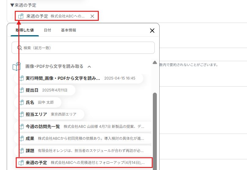 先程取得したアウトプット を使用していきましょう! 今週の訪問先一覧はアウトプットから選択します。
