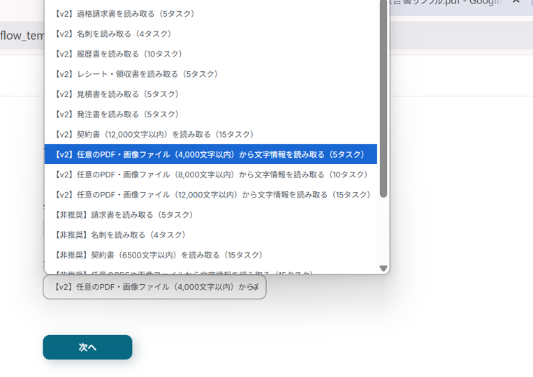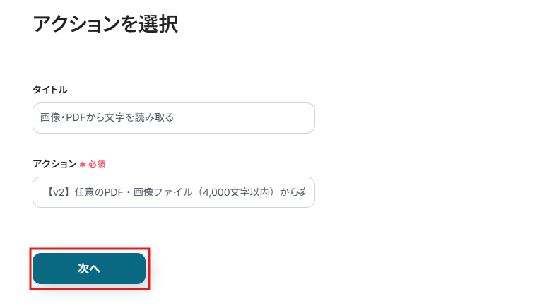 アクションは「任意のPDF・画像ファイルから文字を読み取る」を選択しましょう! 今回は4,000文字以内を選択しました。