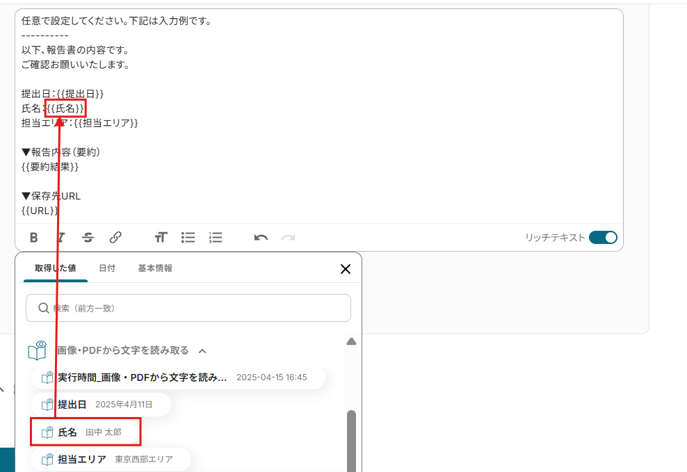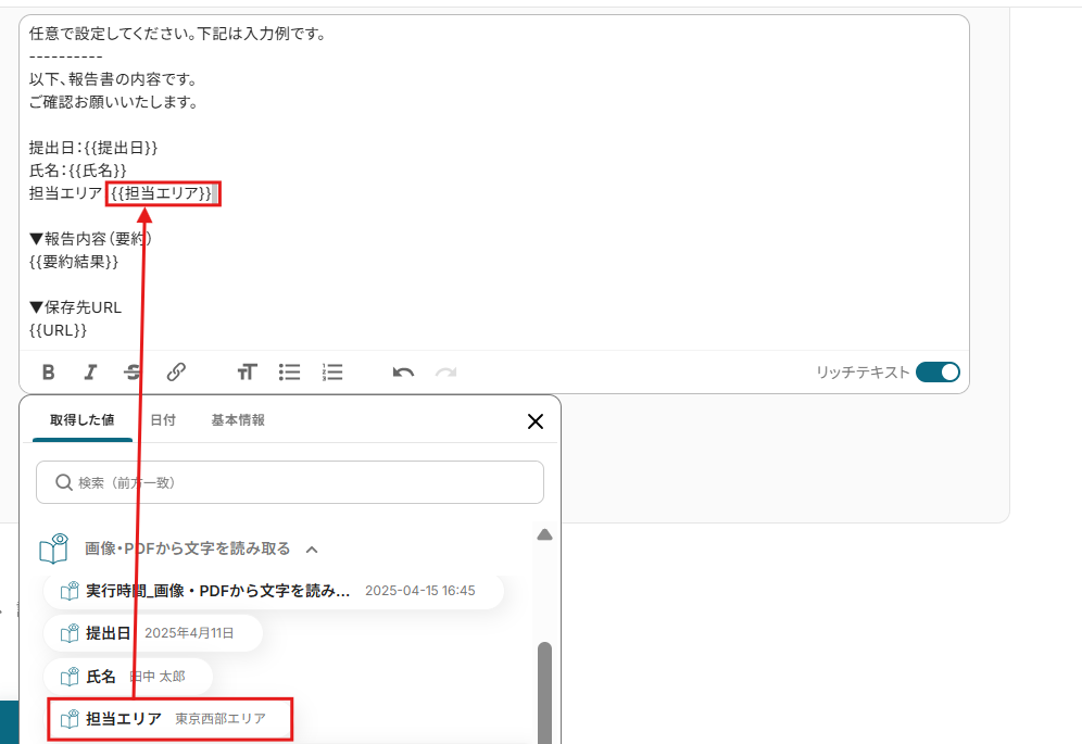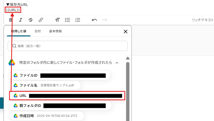 テストで取得した値を確認しましょう! 取得した値を使ってフローを完成させていきます。なお、この取得した値はアウトプット と呼びます。