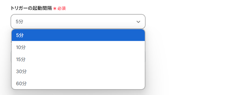 トリガーの起動タイミングは、5分、10分、15分、30分、60分のいずれかで設定可能です。 基本的にはそのプランの最短の起動間隔にしてお使いいただくことをおすすめします。