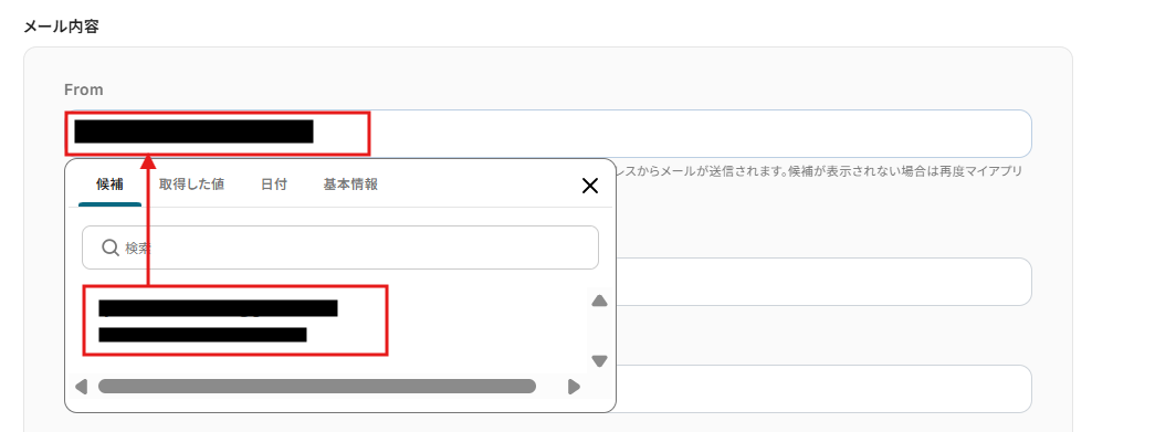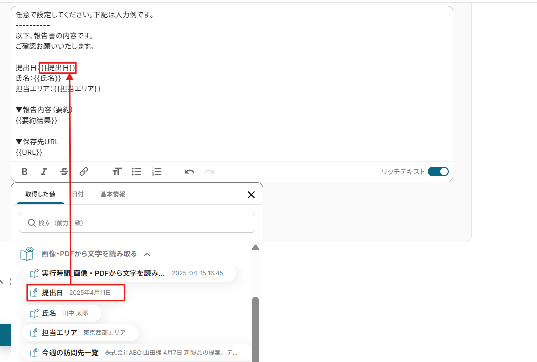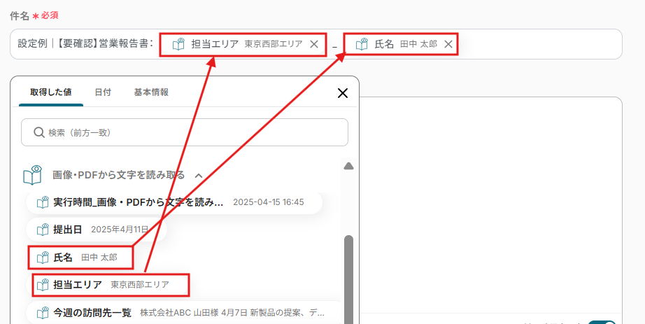 提出日は取得した値から選んでください。 見つけにくい場合は取得した値の検索窓から検索できますよ。