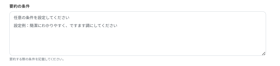 設定例を参考に入力してください。 例えば「箇条書きで簡潔にまとめてください」などでもOKです。ニーズに合わせた設定ができるのがうれしいポイントですよね!