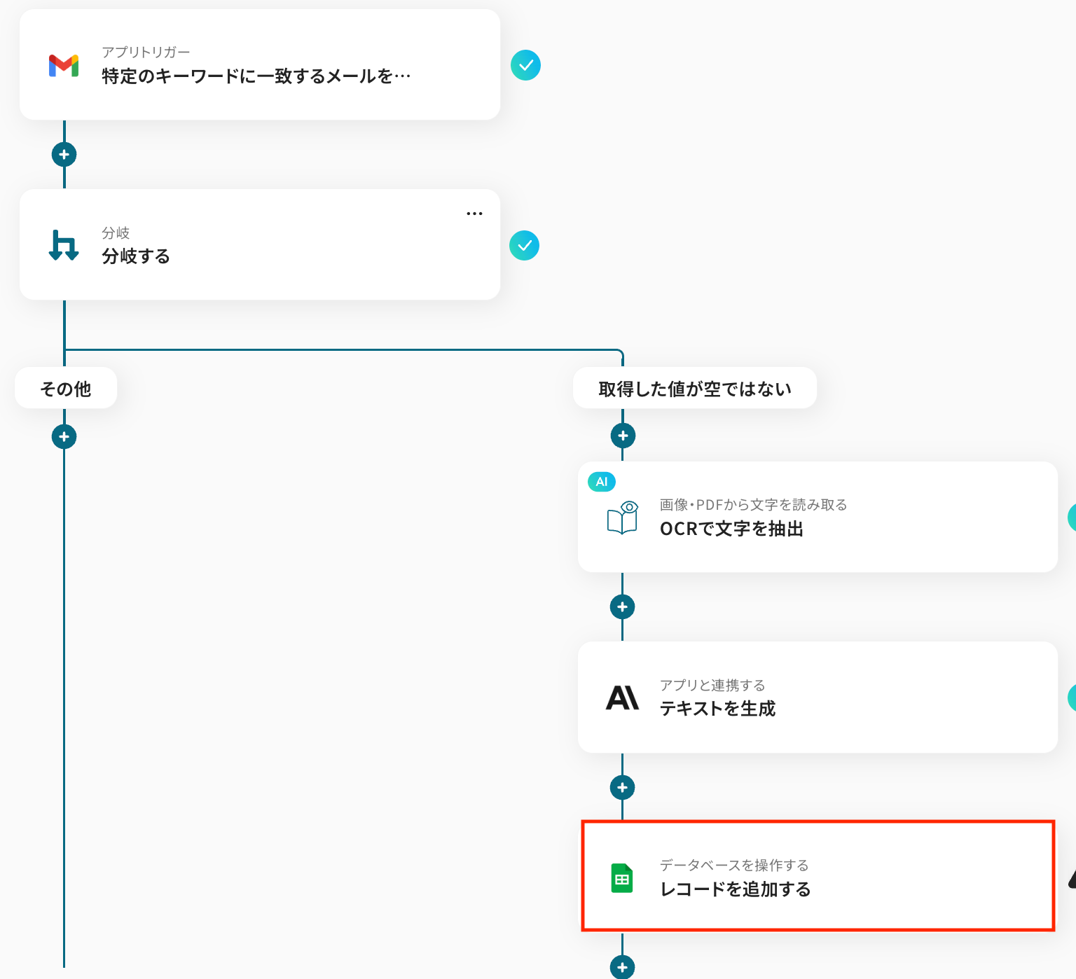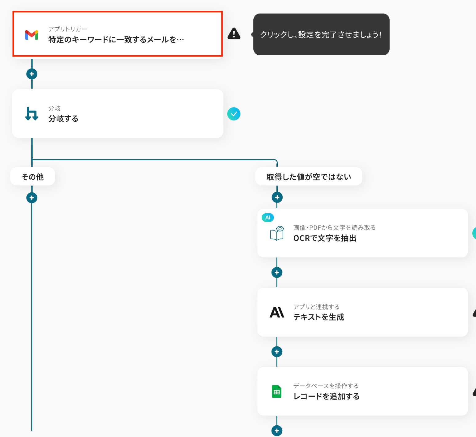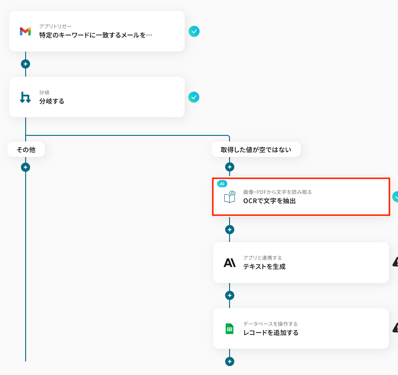 - Gmailのトリガー設定、分岐設定およびOCR処理、Anthropic(Claude)の要約、Google スプレッドシートのアクション設定