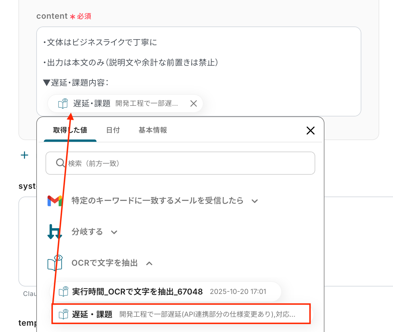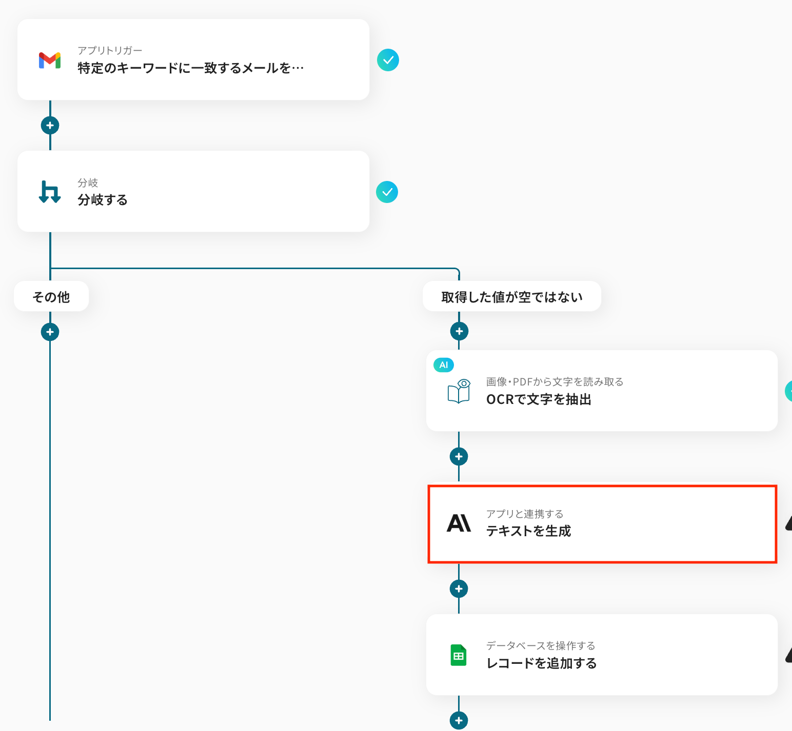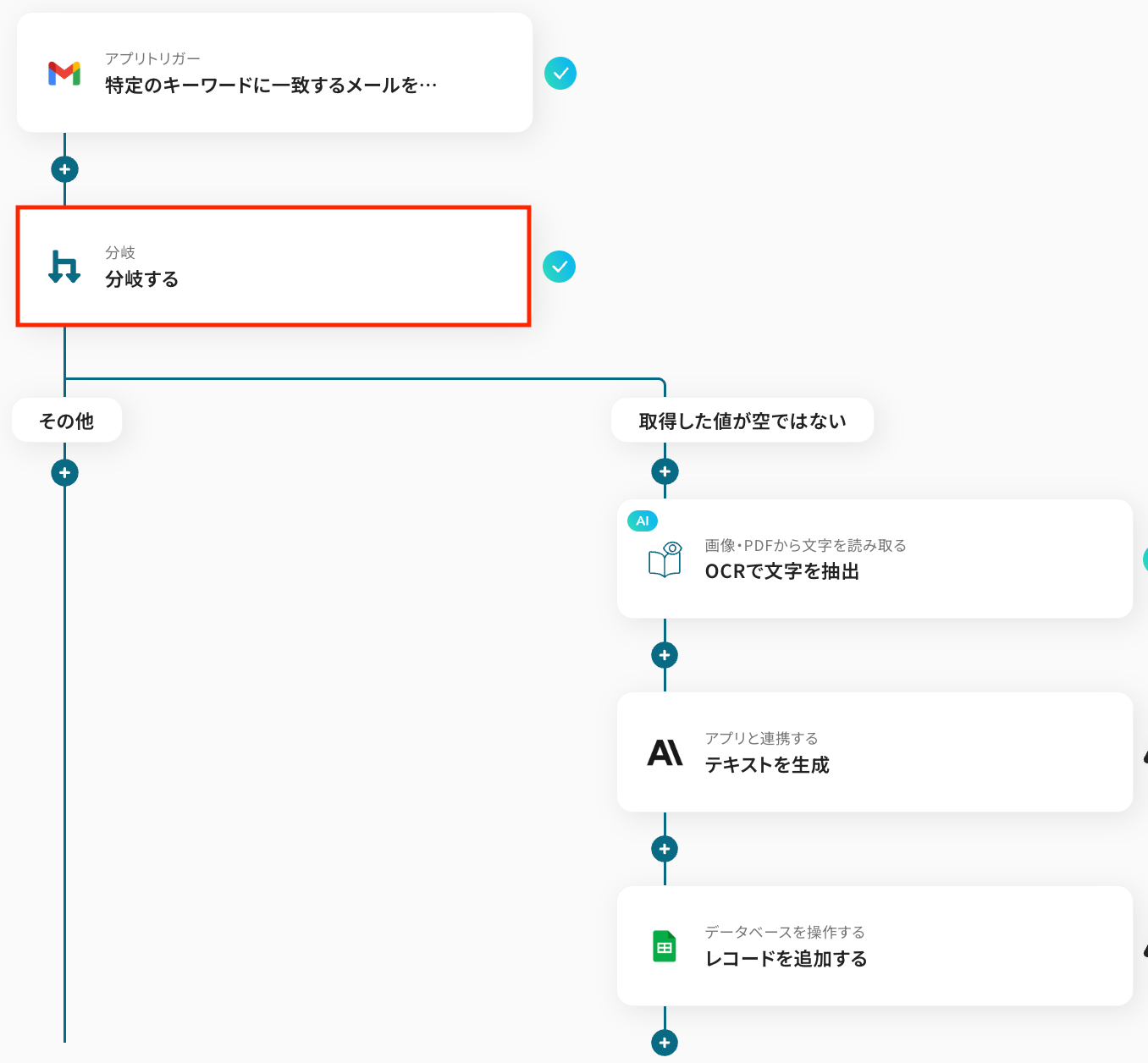 - Gmailのトリガー設定、分岐設定およびOCR処理、Anthropic(Claude)の要約、Google スプレッドシートのアクション設定