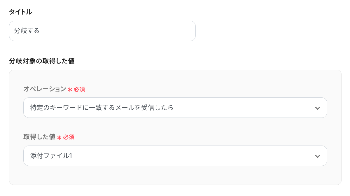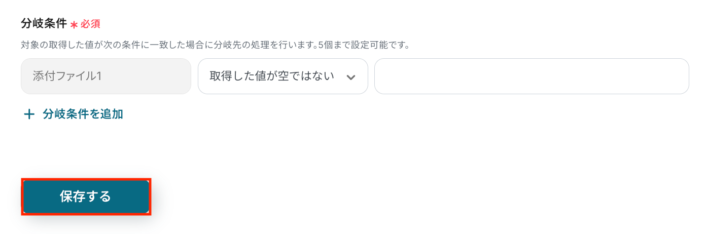 トリガーのステップで受信したメールに、添付ファイルがある場合にのみ後続処理を実行する分岐条件を設定します。