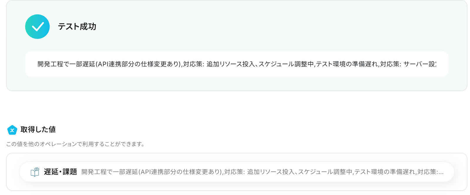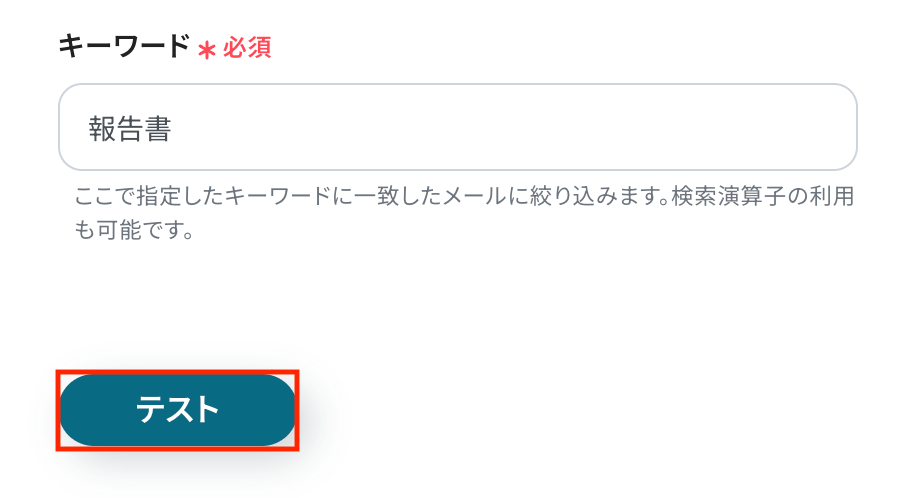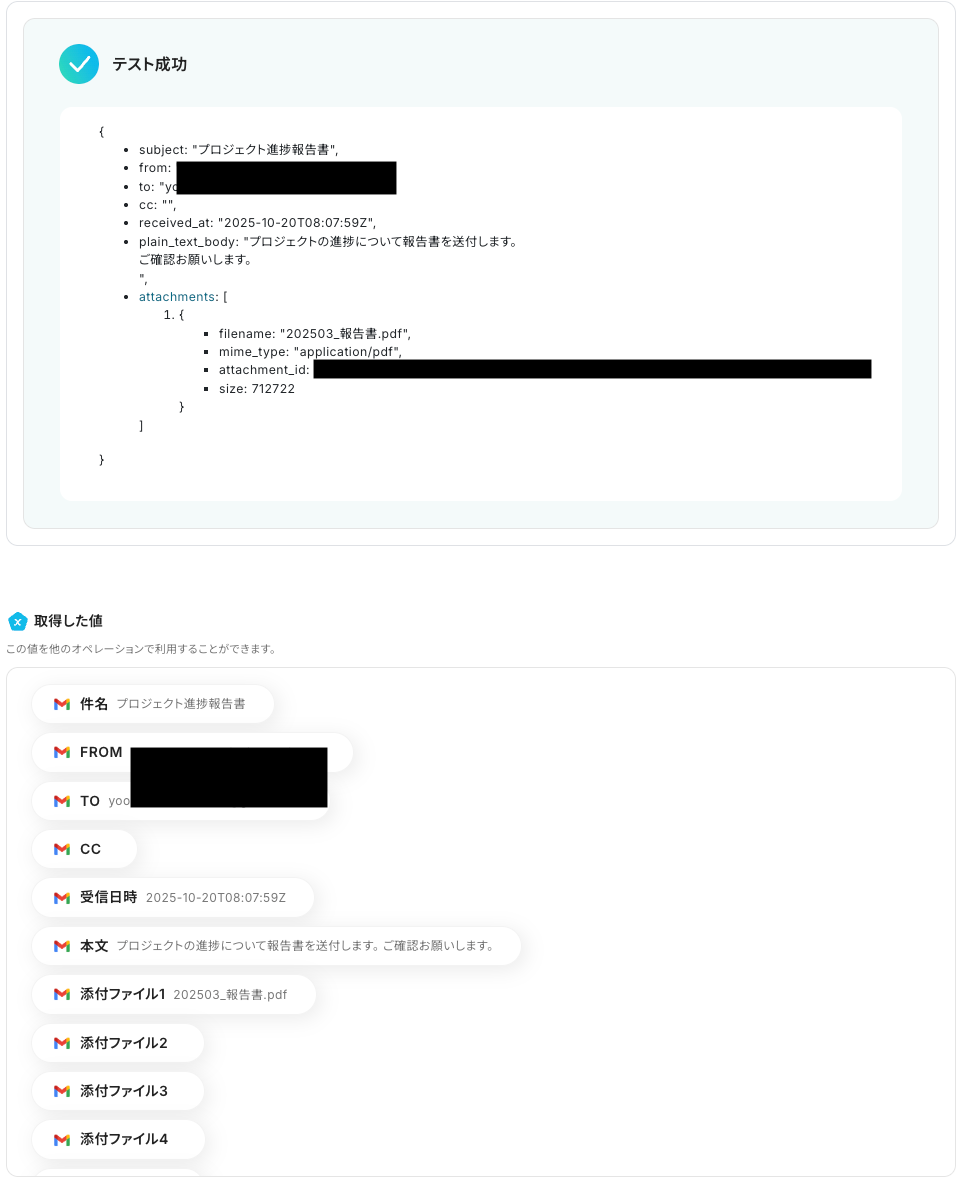 テストに成功すると、Gmailで受信したメールから、特定のキーワード「報告書」を含むメールが検出され、その内容が表示されます。