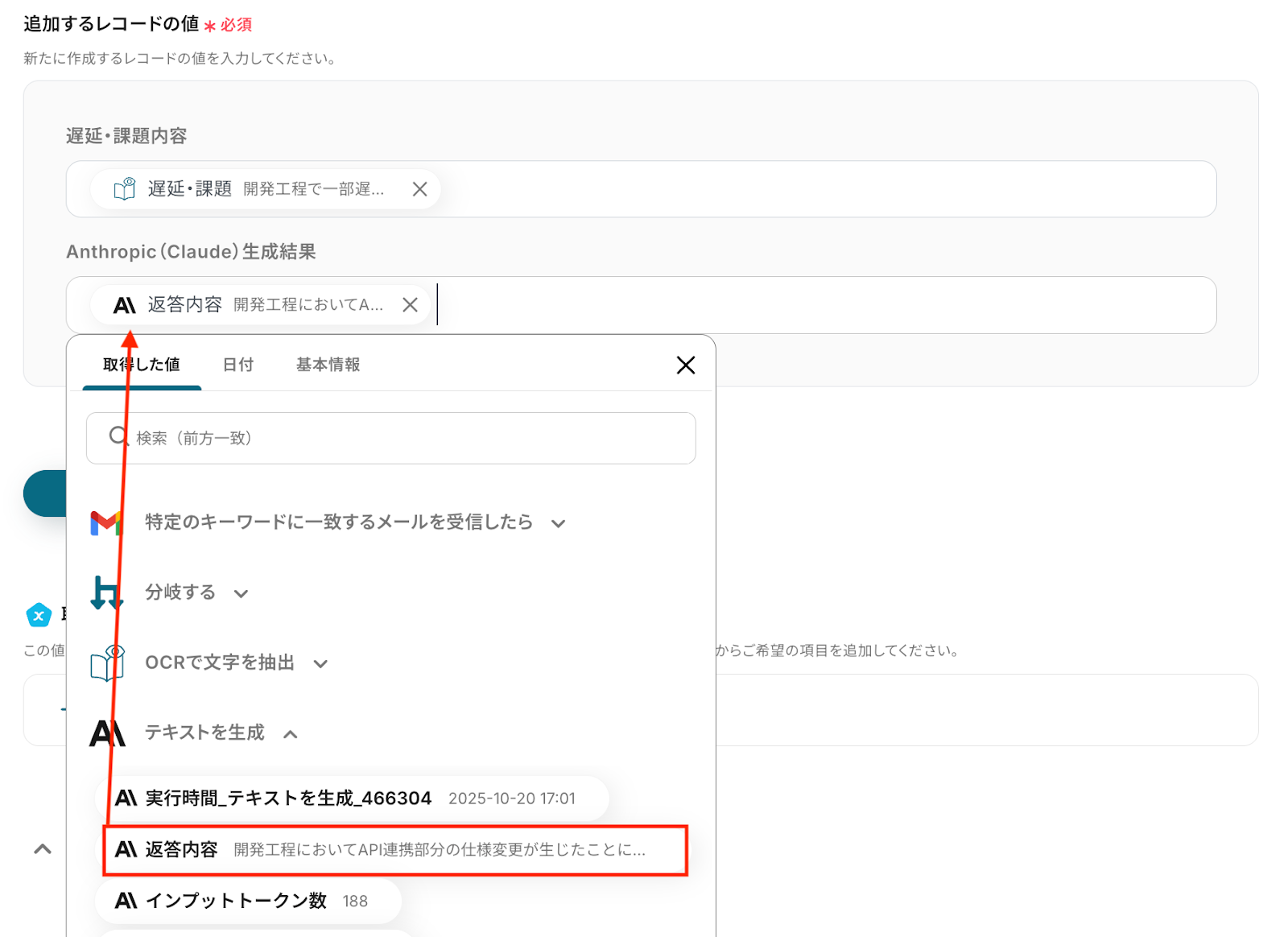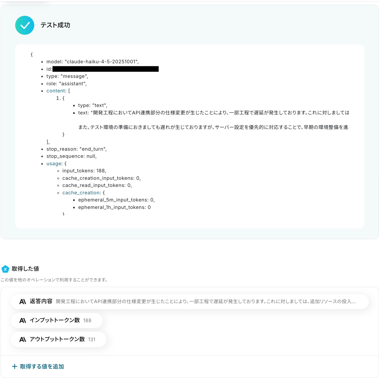 Anthropic(Claude)のテキスト生成アクションでは、プロンプト内で要約の文字数や出力形式(例:箇条書き、段落、特定の観点に絞った要約など)を自由に指示できます。