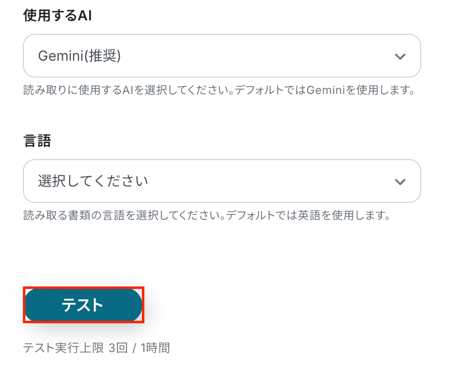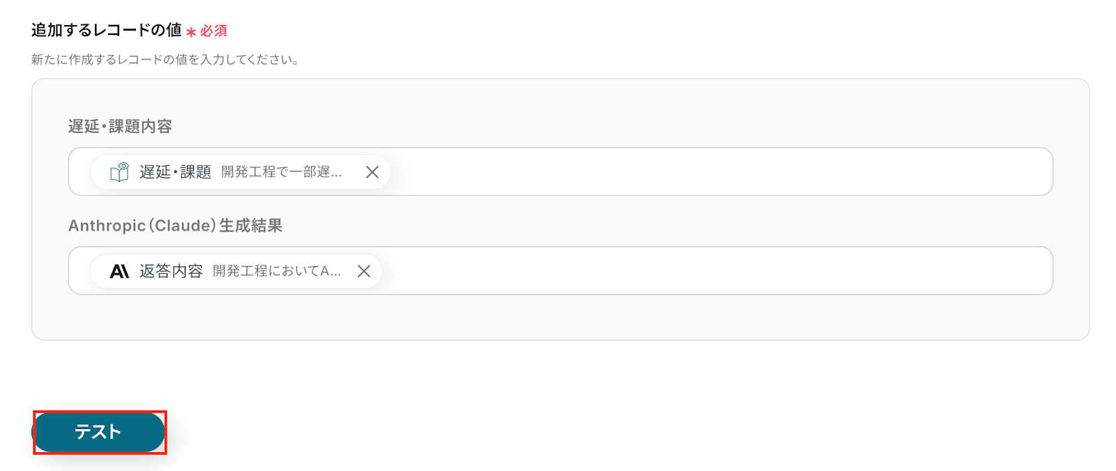 入力が完了したら、設定内容とトリガーの動作を確認するため「テスト」をクリックします。